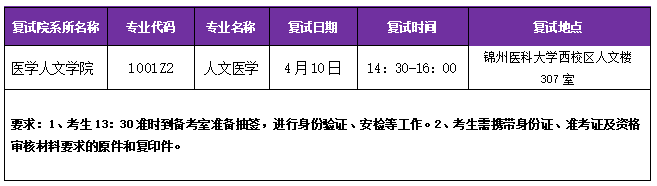 根据锦州医科大学2026年硕士研究生招生复试录取工作方案,医学人文学院拟于4月10日进行调剂考生复试。复试形式为现场综合面试。安排如下: