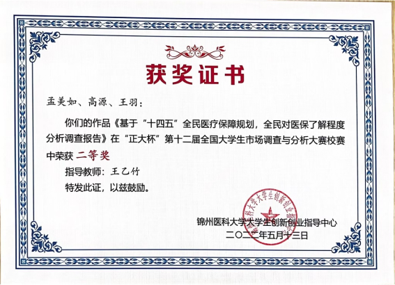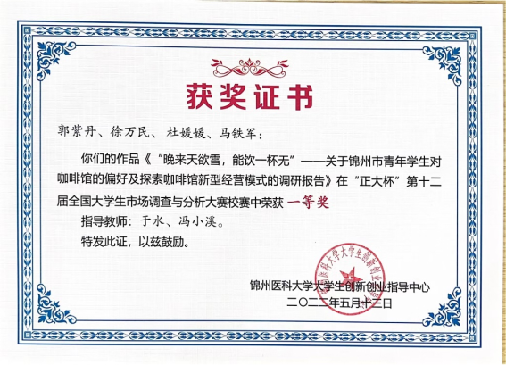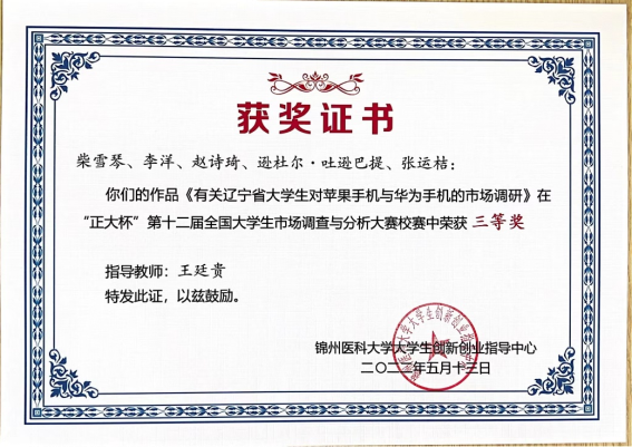 在“正大杯”第十二届全国大学生市场调查与分析大赛校赛中,我院于水、冯小溪老师指导的“旅行青蛙”队伍的《“晚来天欲古,能饮一杯无"一一关于锦州市青年学生对咖啡馆的偏好及探索咖4馆新型经营模式的调研报告》作品获得校赛一等奖并获学校推荐参加省赛、王乙竹指导的“健康小队”队伍的《基于“十四五”全民医疗保障规划,全民对医保了解程度分析调查报告》作品获得校赛二等奖、王廷贵指导的“惊蛰”队伍的《有关辽宁省大学生对苹果手机与华为机的市场调研》作品获得三等奖。