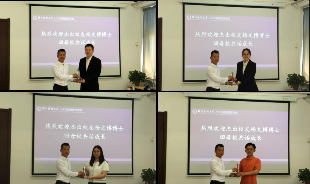 会上,人文与健康管理学院院长高书杰简要介绍了杨文博校友在校优异表现以及毕业后求学、工作成就,鼓励同学们向杨文博校友学习,提升自己的综合能力。姜健向与会人员介绍了学校建设发展情况及今后一段时间重点目标任务,对杨文博校友捐资“文博励志奖学金”和长期以来对学校发展的关心、帮助和支持表示感谢。