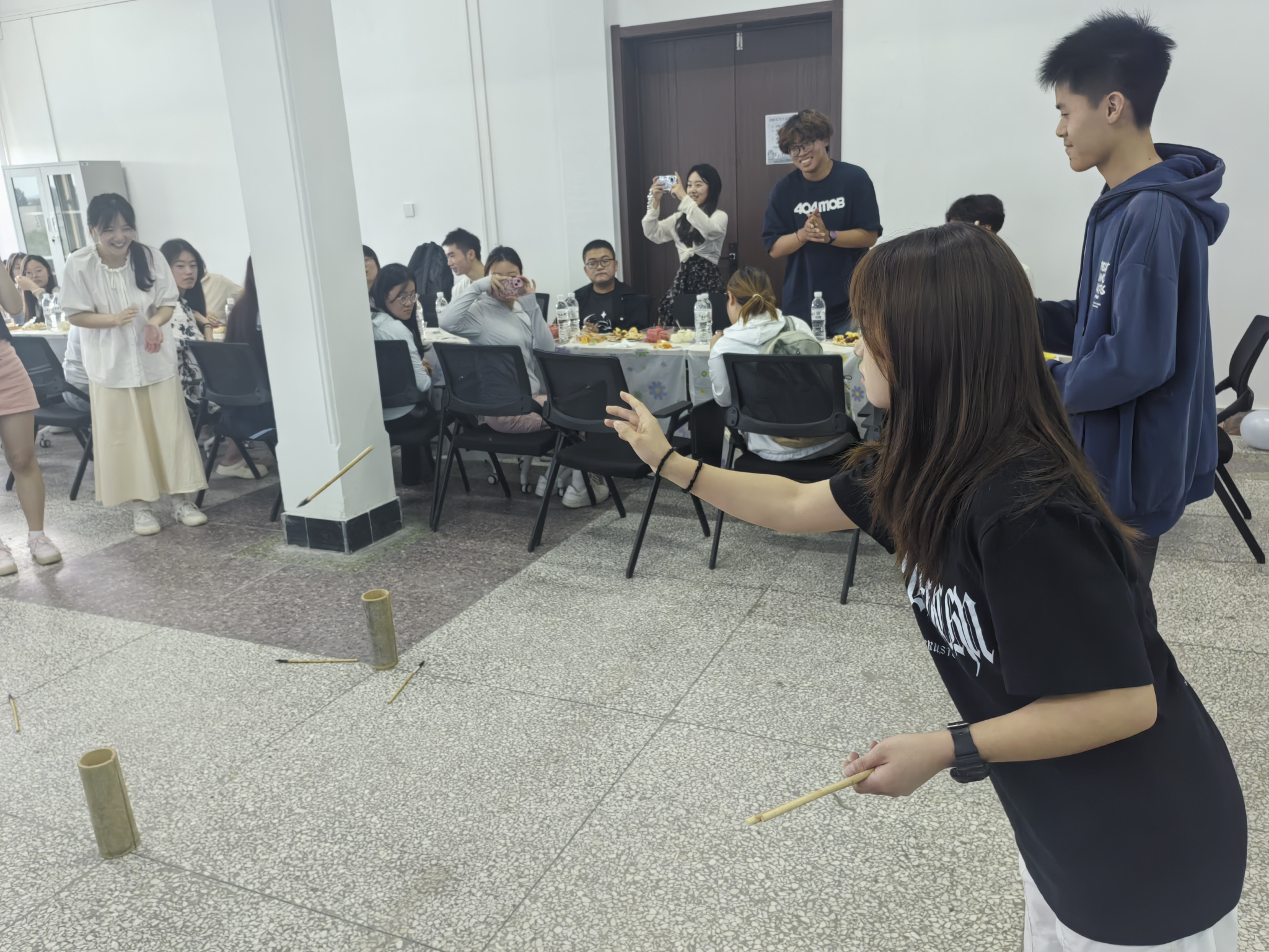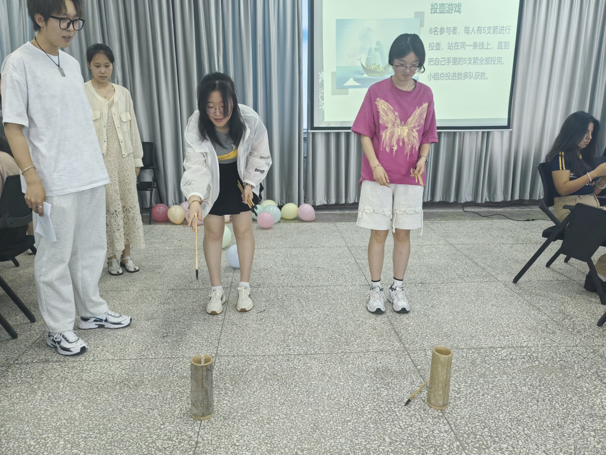 接下来进行游戏环节,第一个游戏——投壶游戏。一群兴致勃勃的参与者围聚在古色古香的投壶场地旁,手持细长的竹箭,全神贯注地瞄准着前方的铜壶。随着一声声清脆的撞击声响起,竹箭划破空气,稳稳地落入壶中,发出悦耳的叮咚声,引发周围观众的阵阵喝彩。