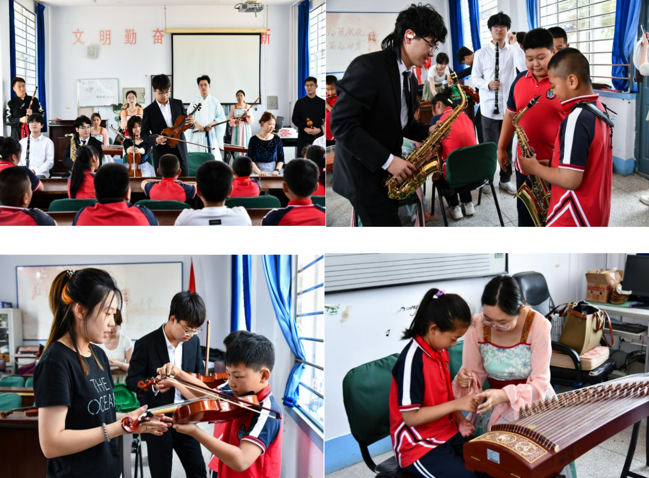 在暑假即将到来之际,美育教师带领大学生艺术团管弦乐团、民乐队的学生代表走进流水村小学,开启“丝竹传情·童心向美”主题课堂。艺术团队突破传统演奏形式,带来管弦乐与民乐创意合奏《哪吒》。激昂的唢呐与悠扬的笛声交织,西方萨克斯与传统二胡的旋律碰撞,改编自国产动画的主题曲以全新面貌呈现,瞬间点燃全场热情。表演过后,团队成员为孩子们介绍刚刚演奏的每种乐器的起源、构造、演奏方法、艺术价值、代表曲目等,加强了对器乐文化的了解。在互动环节,孩子们对喜欢的乐器进行了一对一的演奏体验,第一次亲手接触乐器让大家非常新奇、兴奋。在队员的耐心指导下,孩子们很快掌握了基本演奏方法,在课堂最后大家共同完成了一曲《小星星》,虽然还不熟练,但艺术的种子已然在心里种下。