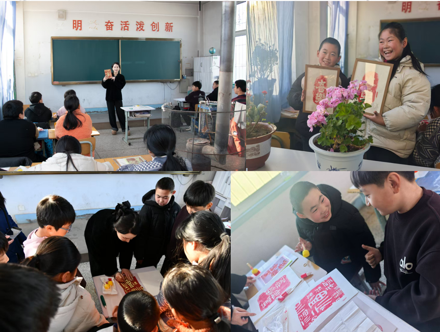 龙舞新春,马驰盛世。在2026年新年即将到来之际,美育教师再次来到流水村小学开展了“童心绘新愿 携手启华章”主题非遗体验课堂。教师为孩子们讲解了非遗拓印技艺的历史渊源与文化内涵,从汉代画像石到敦煌壁画,从活字印刷到门神年画,孩子们在故事中感受传统技艺的智慧。实践环节,在教师的指导下,大家亲手雕刻“平安喜乐”“万事顺意”“百福图”等吉祥纹样模板,用红色颜料在宣纸上印出新年愿望。最后,孩子们小心翼翼地将拓印出的画作装裱在框中,看到亲手制作的精美非遗拓印作品,脸上洋溢出喜悦的微笑,共同勾勒出新一年的幸福图景。此次课堂不仅让非遗技艺焕发新生,更引导了孩子们坚定文化自信,送去未来的美好祝福。