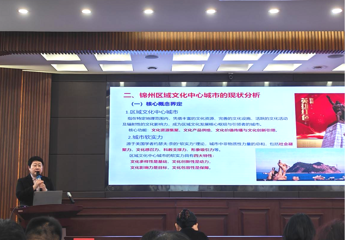 高书杰院长报告的题目是:《谋篇辽西强引领 提升区域首位度》,她从辽西文化资源概述、锦州区域文化中心城市现状分析、辽西文化资源整合困境与策略、提升锦州文化软实力的路径四个方面进行汇报。该项目是锦州市2025年社科联重大课题,研究成果入选了《2025年锦州市咨政建言》,同时在2025年9月5日《锦州日报》上刊发。