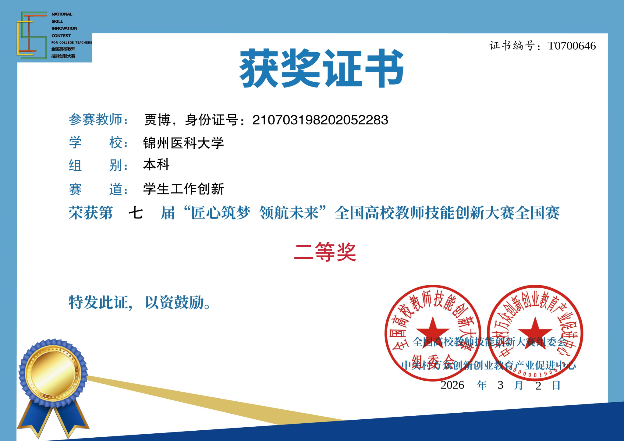 近日,第七届“匠心筑梦 领航未来”全国高校教师技能创新大赛全国赛圆满落幕,赛事结果正式揭晓。我院贾博老师凭借在学生工作领域的深耕细作与创新实践,历经全国初赛、复赛的层层淬炼,在众多参赛选手中脱颖而出,最终荣获学工工作创新赛道全国二等奖,用实力彰显我院教师的专业素养与创新风采。